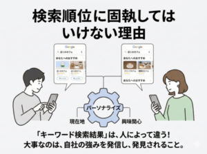 つまり、あなたがご自身のスマホで確認した「自社のお店の見え方や順位」が、他のお客様のスマホでも全く同じように表示されているとは限らないのです!