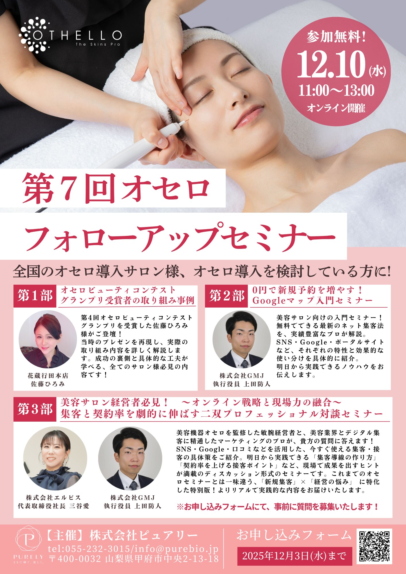 この度、株式会社GMJ(東京都港区愛宕2-5-1愛宕グリーンヒルズMORIタワー34階代表取締役:高本誠也、公式サイト:https://gmj.ne.jp)は、株式会社ピュアリー(山梨県甲府市中央2-13-18 代表取締役:志田 伊織 公式サイト:https://www.purebio.jp/ )と2025年12月10日(水)11時00分~「第7回オセロフォローアップセミナー」と題したウェビナーを共催いたします。